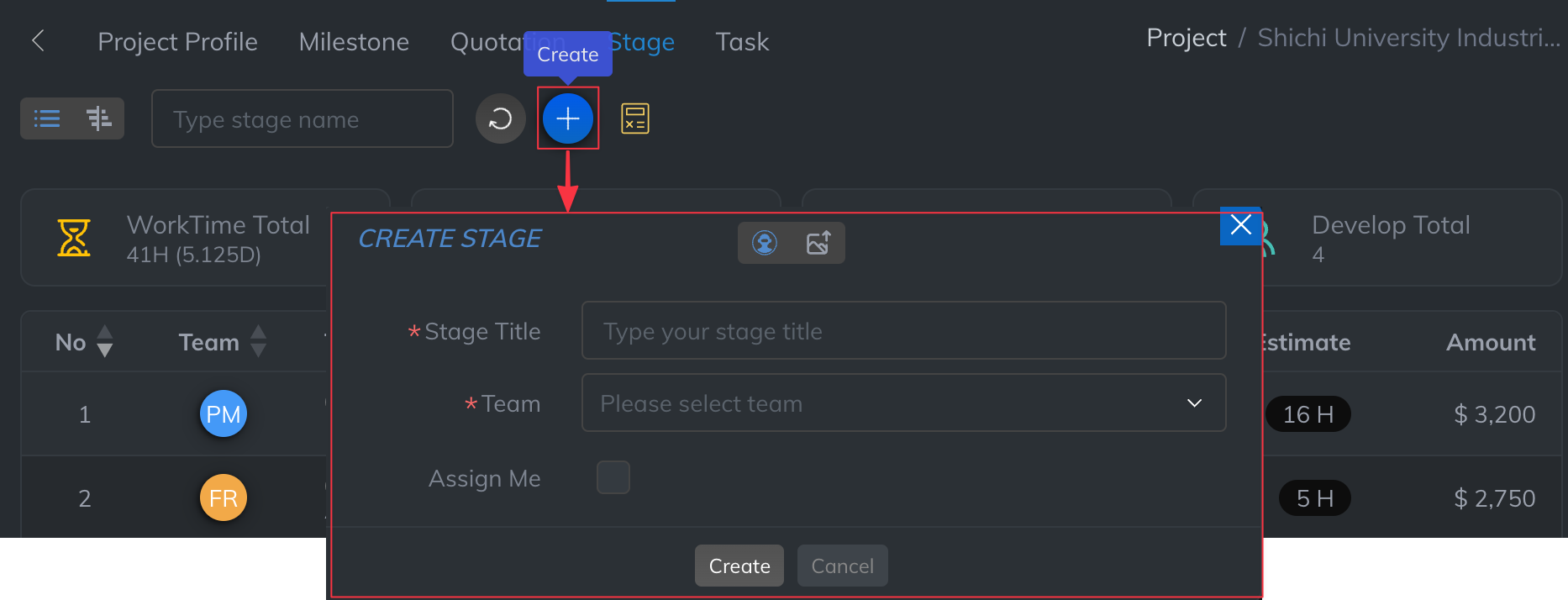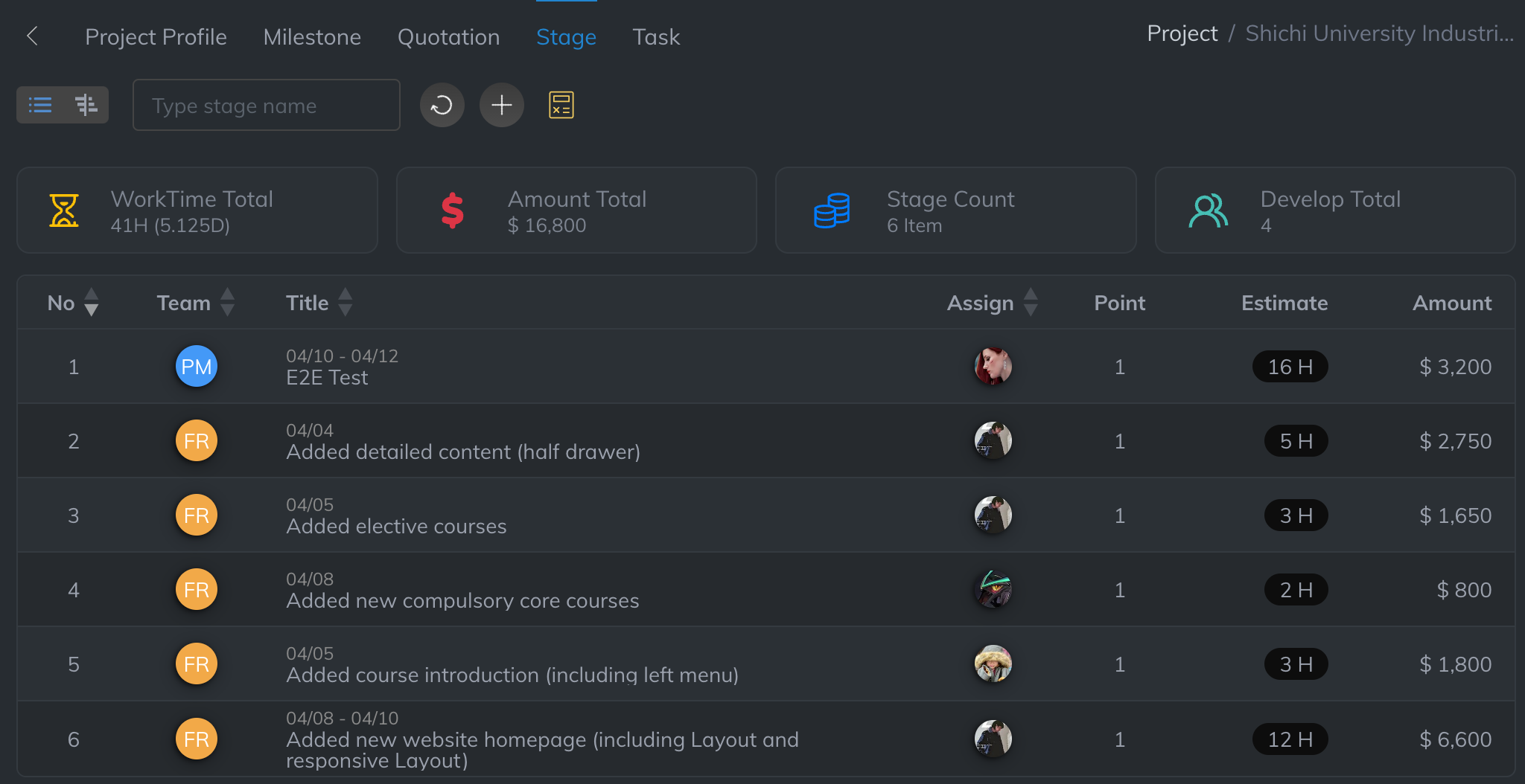 The list above shows an overview of the entire project, including total hours, total amount, total number of stage evaluation projects, and total number of developers.
