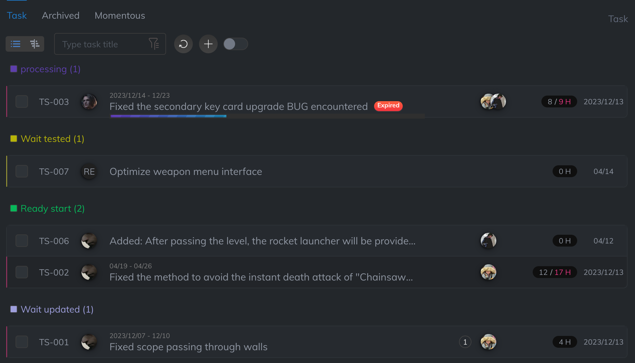 The task list uses status groups to allow you to more quickly check the status of different tasks. For example, which tasks are currently waiting for confirmation, which tasks are waiting for testing, who is currently assigned to them, and whether the tasks have expired.